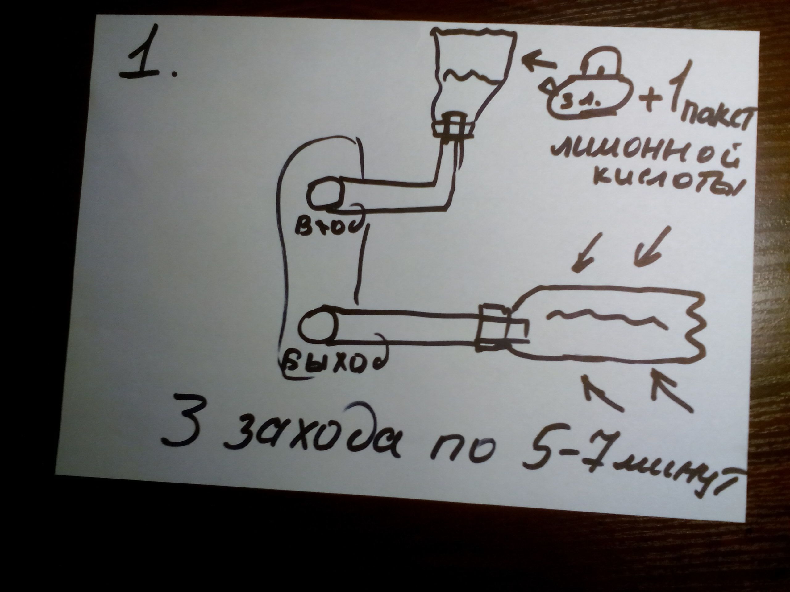 !!!-сначала выдуваем остаток тосола с печки -сжимаем целую баклашку чтобы в ней было как можно меньше воздуха и залил в лейку кипяточек с кислотой