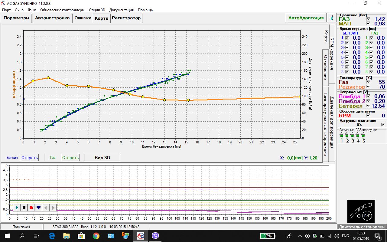 Без ОБД. Вернее обд через елмку, а остальное через программу стага. Ну и сильно помогла авто адаптация стаговская. А зенит и с обд и автоадаптпцией а выдает кривую, как бык поссал.
