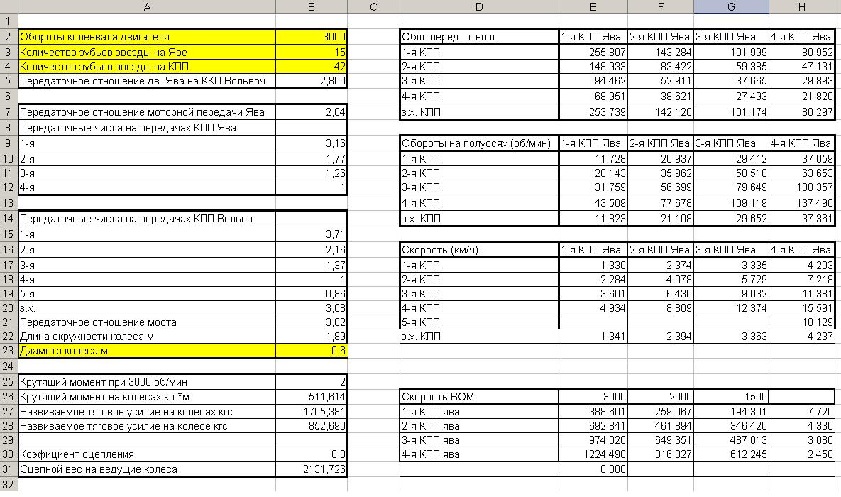 Для понимания того как влияет большое передаточное число на скорость и крутящий момент, вот расчет скорости, крутящего момента на колесах и сцепного веса с явовским мотором, вольвовской кпп и цепным редуктором, с общим передаточным 2,8. Картинка кликабельна можно увеличить.
