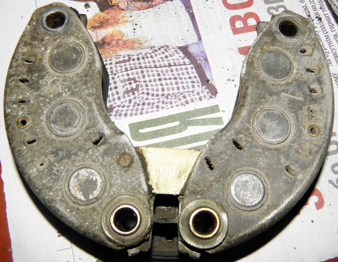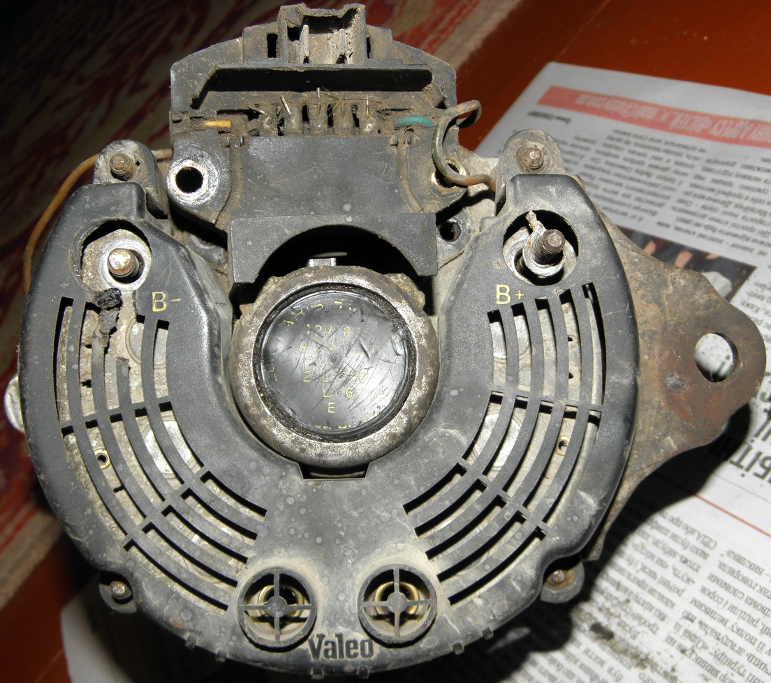 Накрылся генератор, пробиты несколько диодов... Началось с того, что садился аккумулятор, потом я аккумулятор хорошо зарядил от зарядки, подключаю, а в машине что-то коротит - оказалось генератор (оттуда дымок пошел). Друзья, подскажите, чем недорогим можно заменить. Какие варианты походят. У меня двигадель Volvo В200К. Или возможно надо только диоды заменить, но есть ли они в продаже? Фото прилагаю...