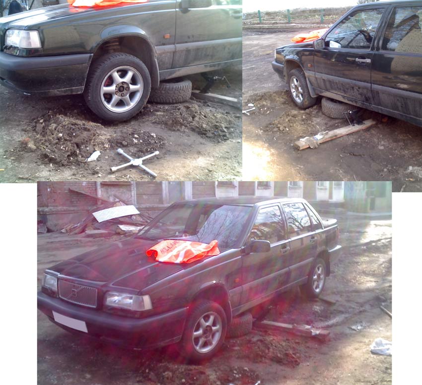Решил сам поменять колёса! неправильная позиция автомобиля и дурацкая система домкрата (один на сторону) привела к завалу и в последствии копание ямы для одевания колеса! короче было весело)))))))))))) +с помощью трубы в качестве рычага срывал болты