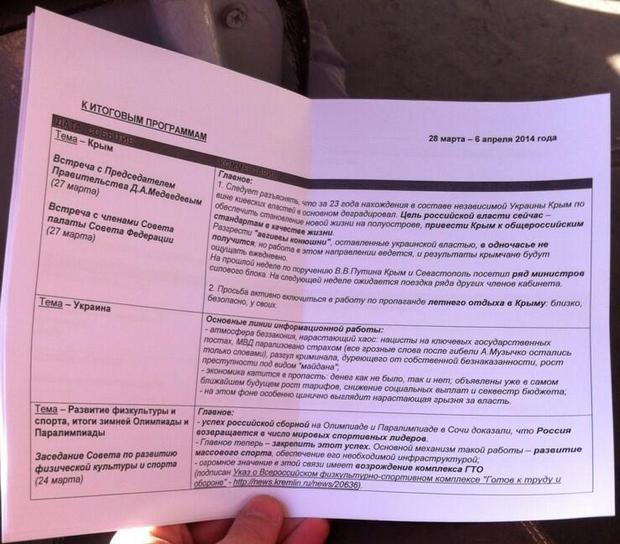От журналистов, в частности, требуют разъяснить, что "за 23 года нахождения в составе независимой Украины Крым по вине киевских властей в основном деградировал", а "цель российской власти сейчас - обеспечить становление новой жизни на полуострове, привести Крым к общероссийским стандартам в качестве жизни".