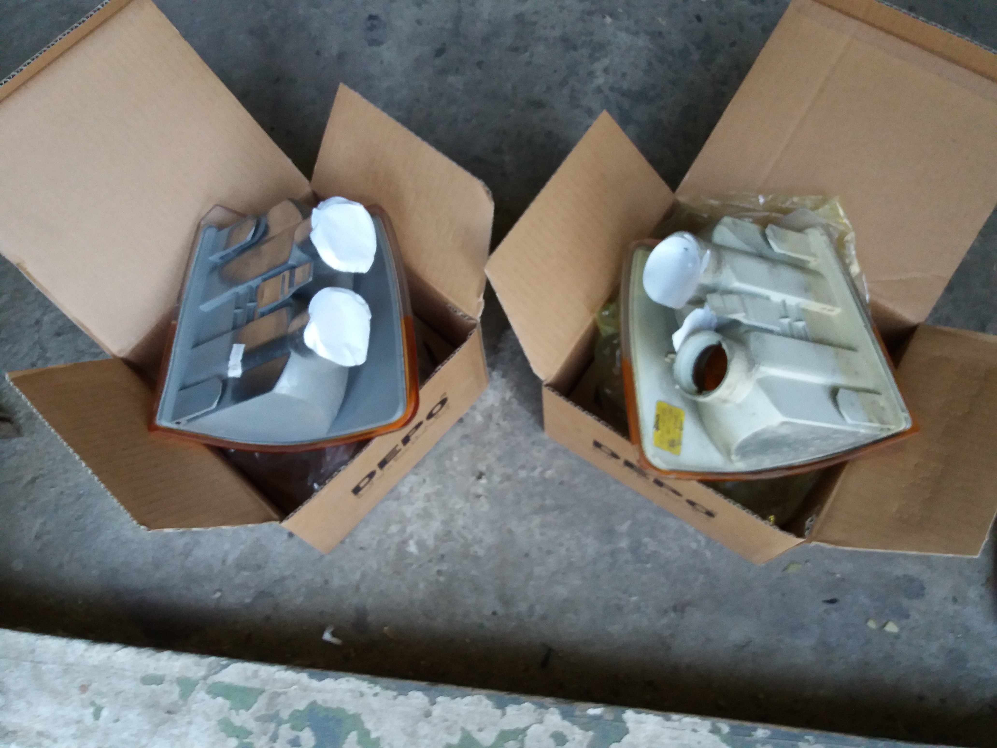 В комплекте 2 фары - правая и левая, естественно. Состояние почти отличное. Все оригинал. Даже лампы есть. К фарами идут крепежные рамки и декоративные вставки, что снизу ставятся и отделяют их от решетки. Во выставках отверстия под очистители фар. И пару поворотников. Один Дэпо, второй Бош. Оба в идеале. На Дэпо есть небольшой дефект внутри стекла. Типа микро трещины. Но ее не видно почти.