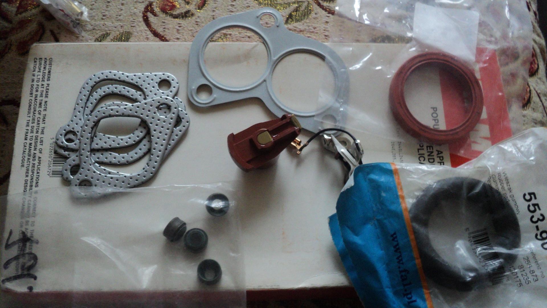 ну и прикупил другие запчастюхи, чтобы зря время не терять: термостат, прокладки впускного и выпускного коллектора и прокладку штанов, кольца на глушитель, бегунок и контакты на трамблер, сальники клапанов коленвала и промвала, и фильтр воздушный.
