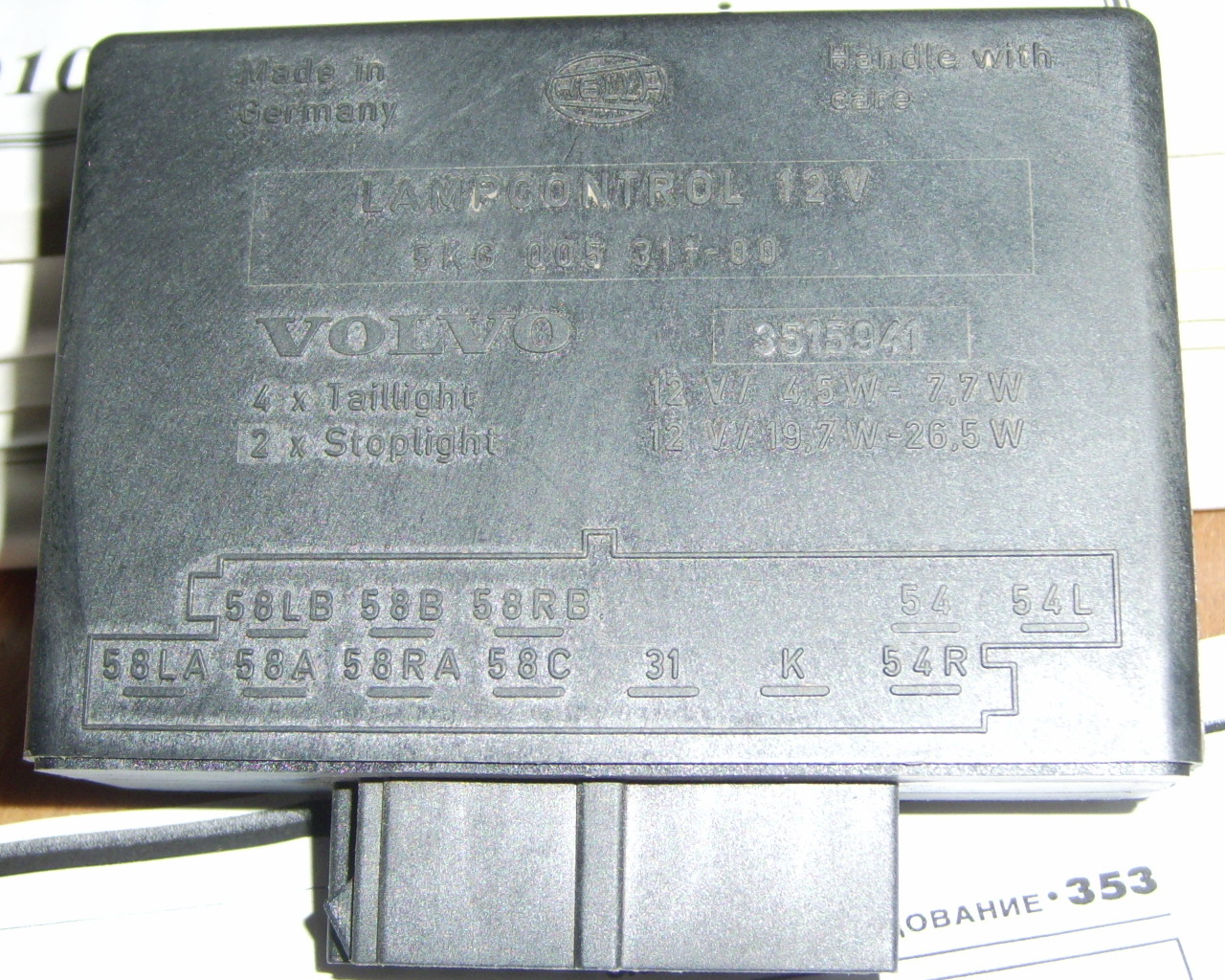 Решил поставить стоп-сигнал под заднее стекло, оригинальный. Купил (спасибо "volvo PS"), снял заднюю полку, подключился к разъему...не пашет :o Земля есть, напруги нет. Странно! Лезем в камасутру, находим схему и выясняем, что питается этот стоп-сигнал от хитрой приблуды под названием "Датчик предупреждения о выходе из строя задних ламп" и вообще, является редкой опцией, для которой в "Датчике.." должен стоять отдельный предохранитель. Насторожило упоминание о том, что "Датчики..." бывают на три стоп-сигнала и немецкие и находится он под задней левой фарой. Лезу, вытягиваю и вижу, что у меня немецкий.