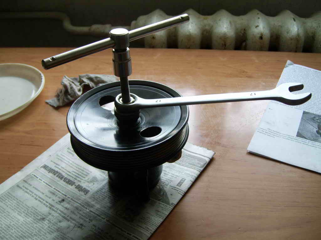 А дальше все как с Статье: все чистим, подшипник стягиваем съемником, новый напрессовываем, используя в качестве оправки внутреннюю обойму старого подшипника, сальник снимаем с помощью того же съемника, вставляем новый, собираем насос до кучи. В Статье, правда, не написано, как одевать шкив на вал, но, я думаю, и так понятно: греем кольцо шкива, через кольцо в вал вкручиваем болт и гайкой через толстую шайбу задавливаем шкив на место. Задавился, к стати, неожиданно легко.
