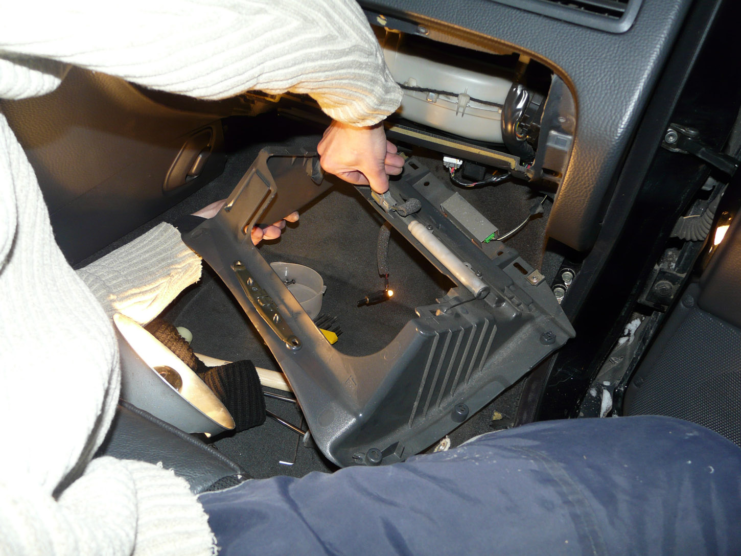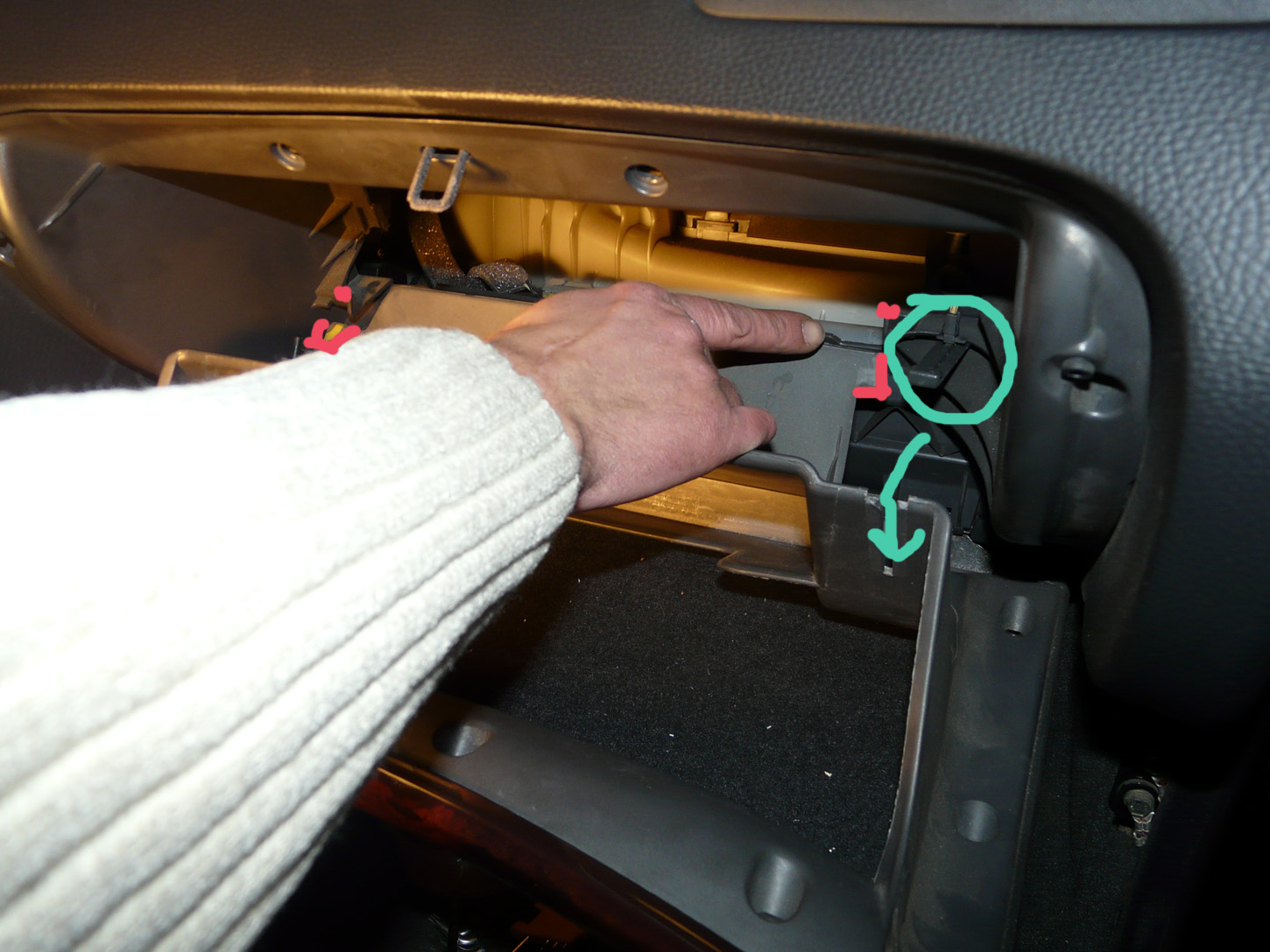Теперь снимаем бардачёк - отсоединив направляющею, снизу вытащив два шплинтика и немного приподняв вверх, он соскакивает с зацеплений и снимается. Следующая "облуда бардачка" - облуда снята!!!.