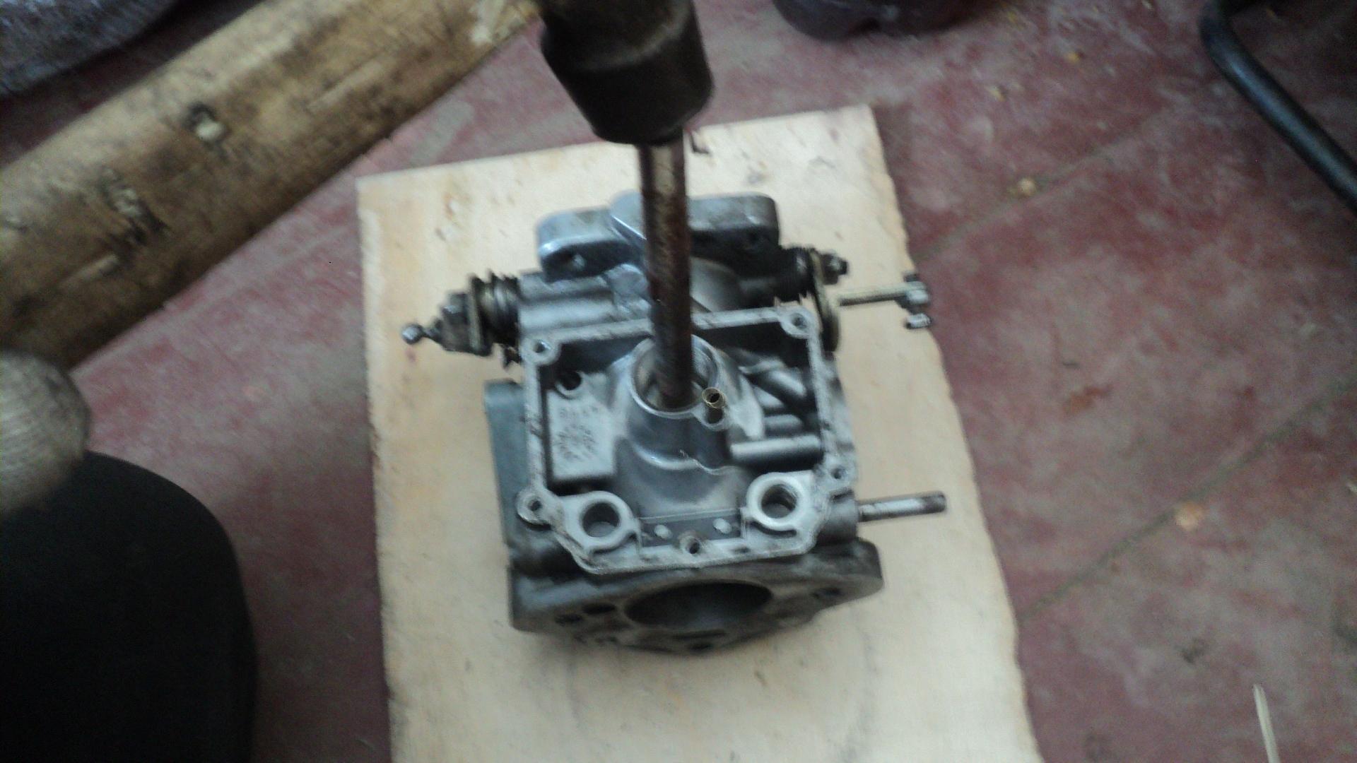 Для извлечения жиклера укладываем на ровную деревянную поверхность карбюратор поплавковой камерой вверх, и начинаем выбивать жиклер ударяя прямо по жиклеру, в жиклере установлена трубка типа удлиннителя чтобы достать до дна поплавковой камеры, эта трубка вынимается из жиклера и можно бить по жиклеру через проставку, диаметром 6 мм, мне пришелось по вкусу обломанное сверло на 6 оно довольно хорошо вошло вместо трубки и не долго сопротивляясь жиклер вышел.