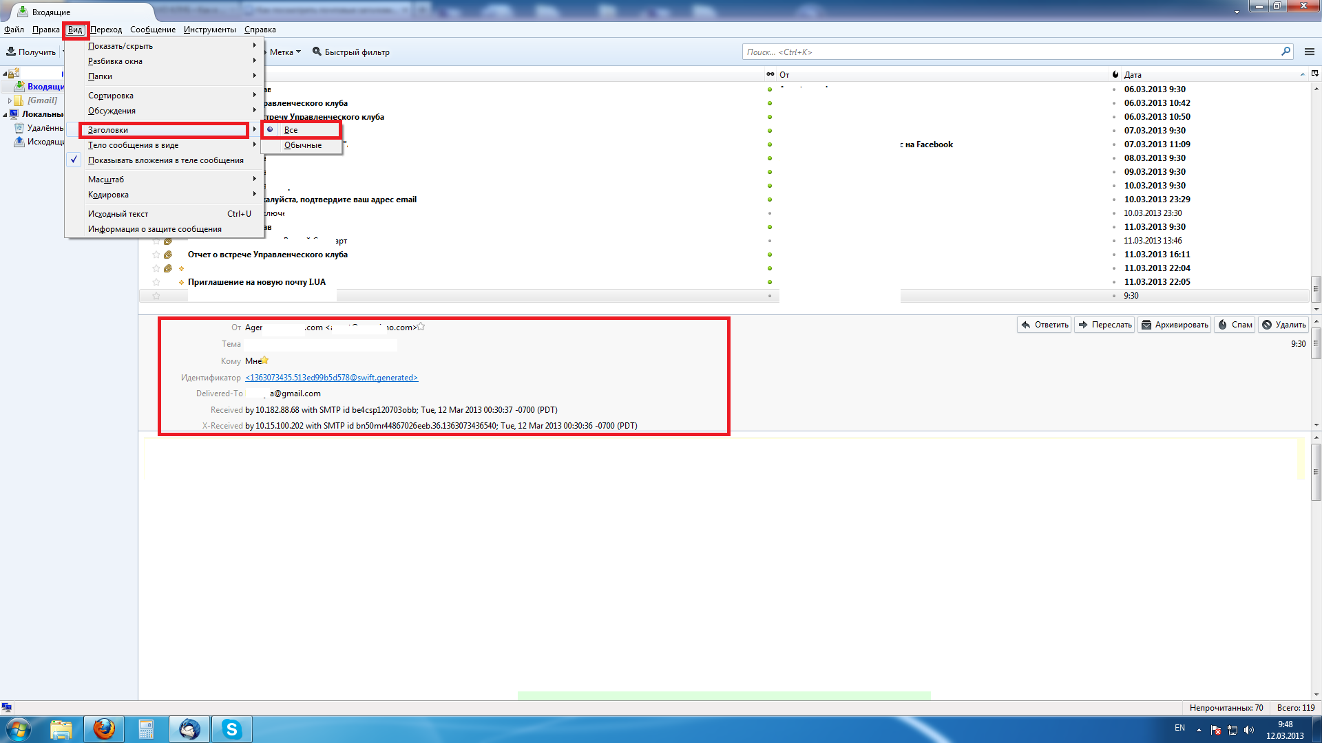 Как посмотреть заголовки через веб браузер не знаю (вернее никогда не ставил такую цель). В Mozilla Thunderbird это делается следующим образом: Нажимаете "Вид" -> "Заголовки" -> "Все" и в панели посредине экрана будут отображаться все заголовки, которые содержит письмо.