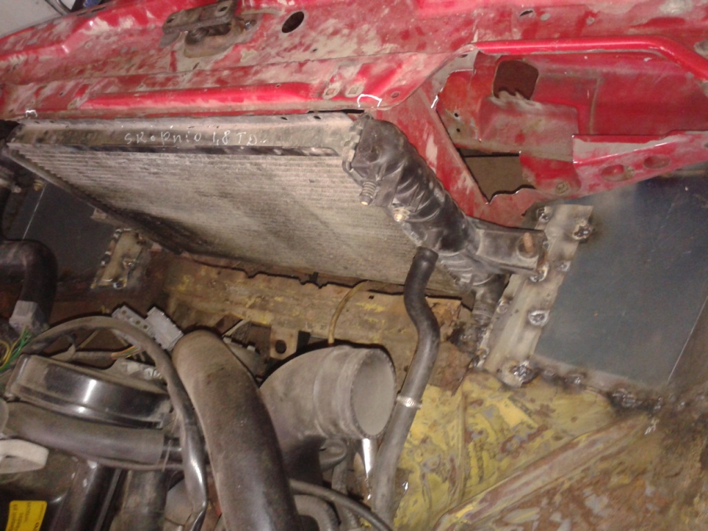 родной радиатор под ел. вентилятор оказался здесь очень большой, поетому было принято решение замены его на Фордовский с сиерры, он не такой высокий и что интересно, по патрубках точно такой же! сделал для него крепления--вроди норм. получилось! 8-)