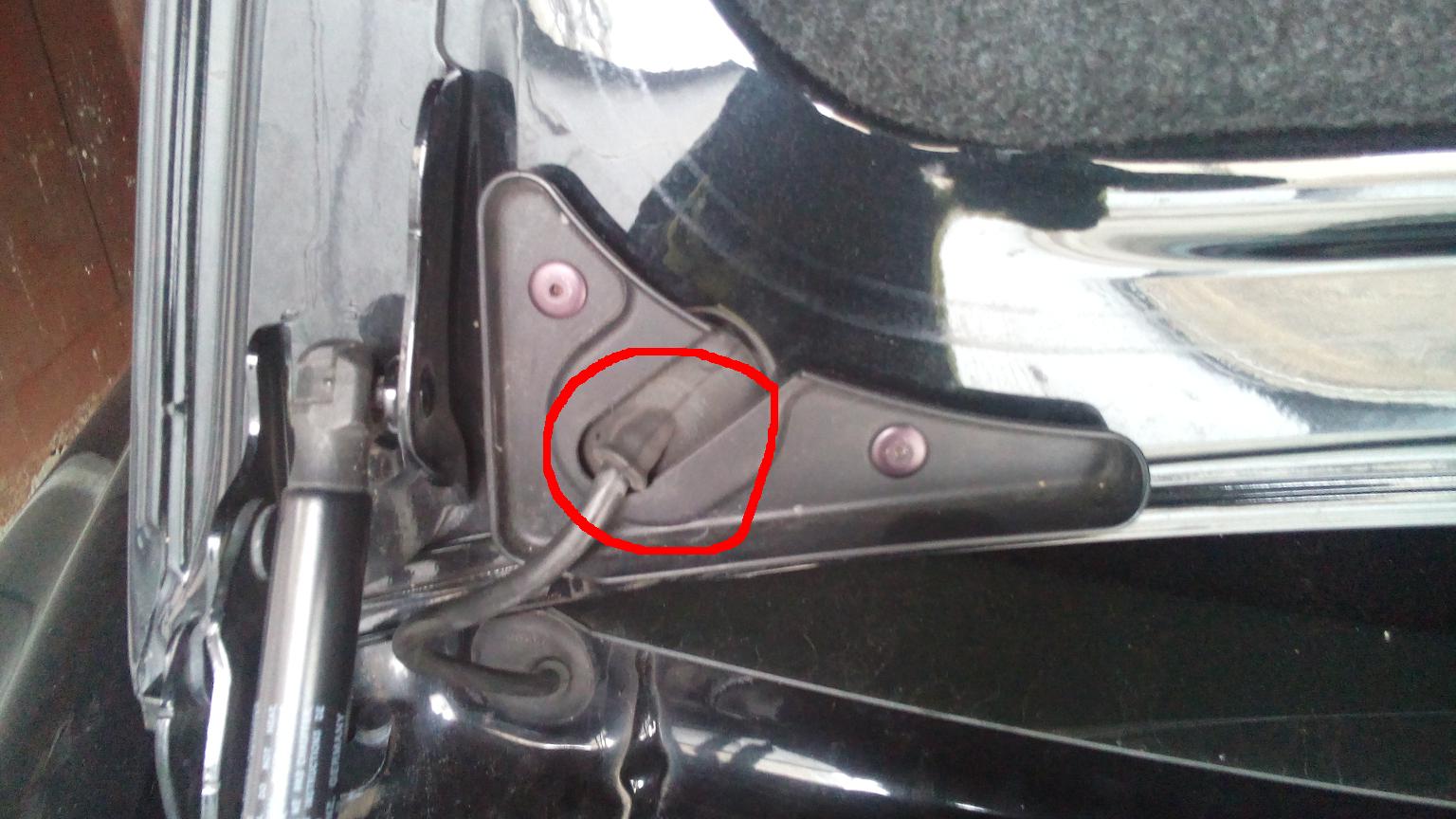 При открытии багажника пеерстал загораться свет внутри, гаснет подсветка номера. Подергав провод в разных местах, выяснил, что в месте, обозначеном на фото 1 провод поврежден. Снаружи никаких призноков повреждений нет.