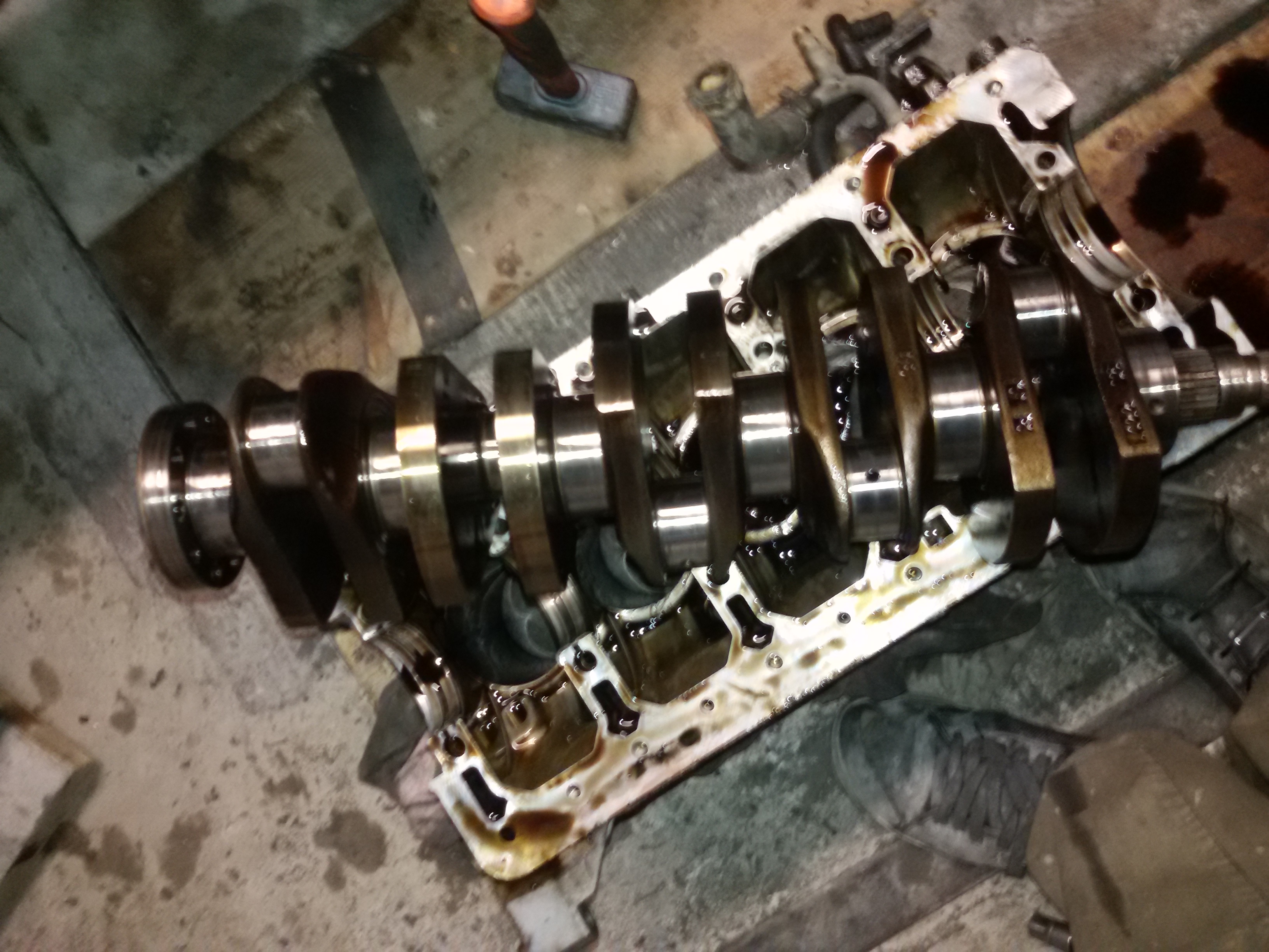коленвал: по корню шлифован на 0.25, стоят новые вкладыши. шатунные стандарт, на 3м цилиндре провернуло шатунный вкладыш - шейка не пострадала(шатун в утиль) - 1000грн с коренными вкладышами