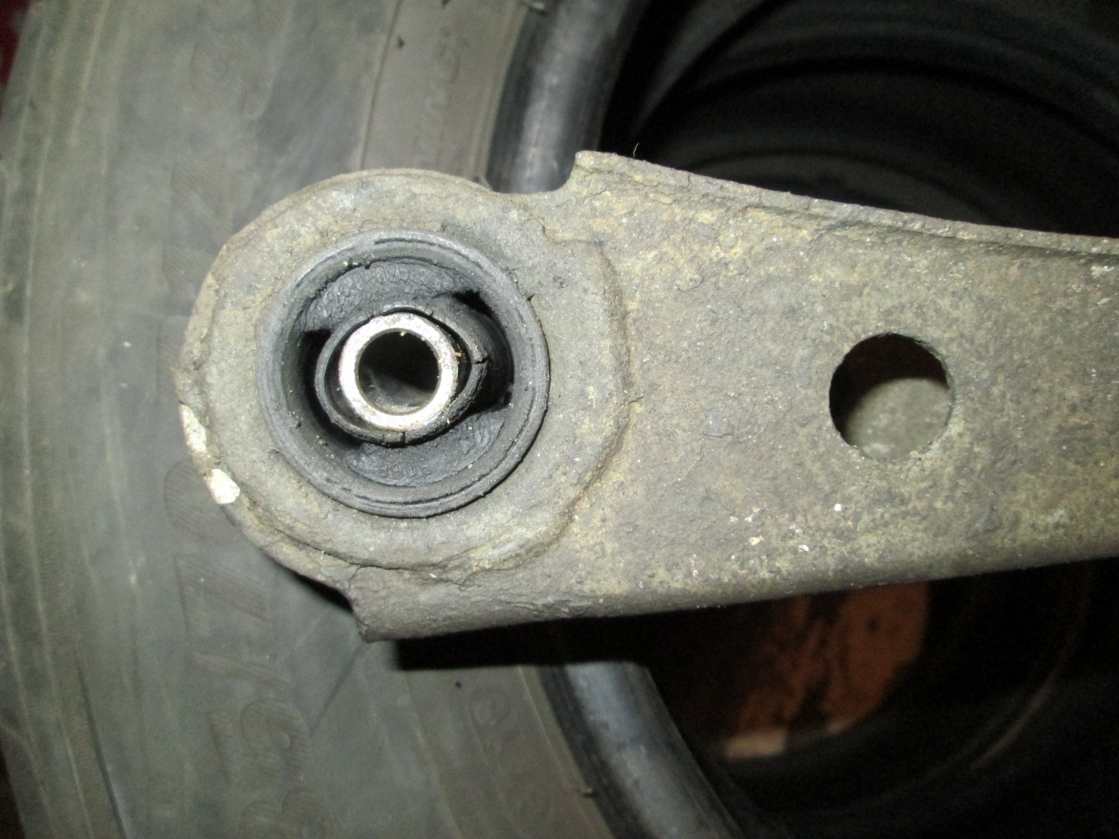 Возле гаража, который снимаю - эстакада. Загнал, подпер досками колеса на правой стороне. Позаглядывал. На правом заднем продольном рычаге передний сайлентблок (он не цельный, с прорезями) мертв: внутренняя втулка отслоилась и сожрала резину сайлента.