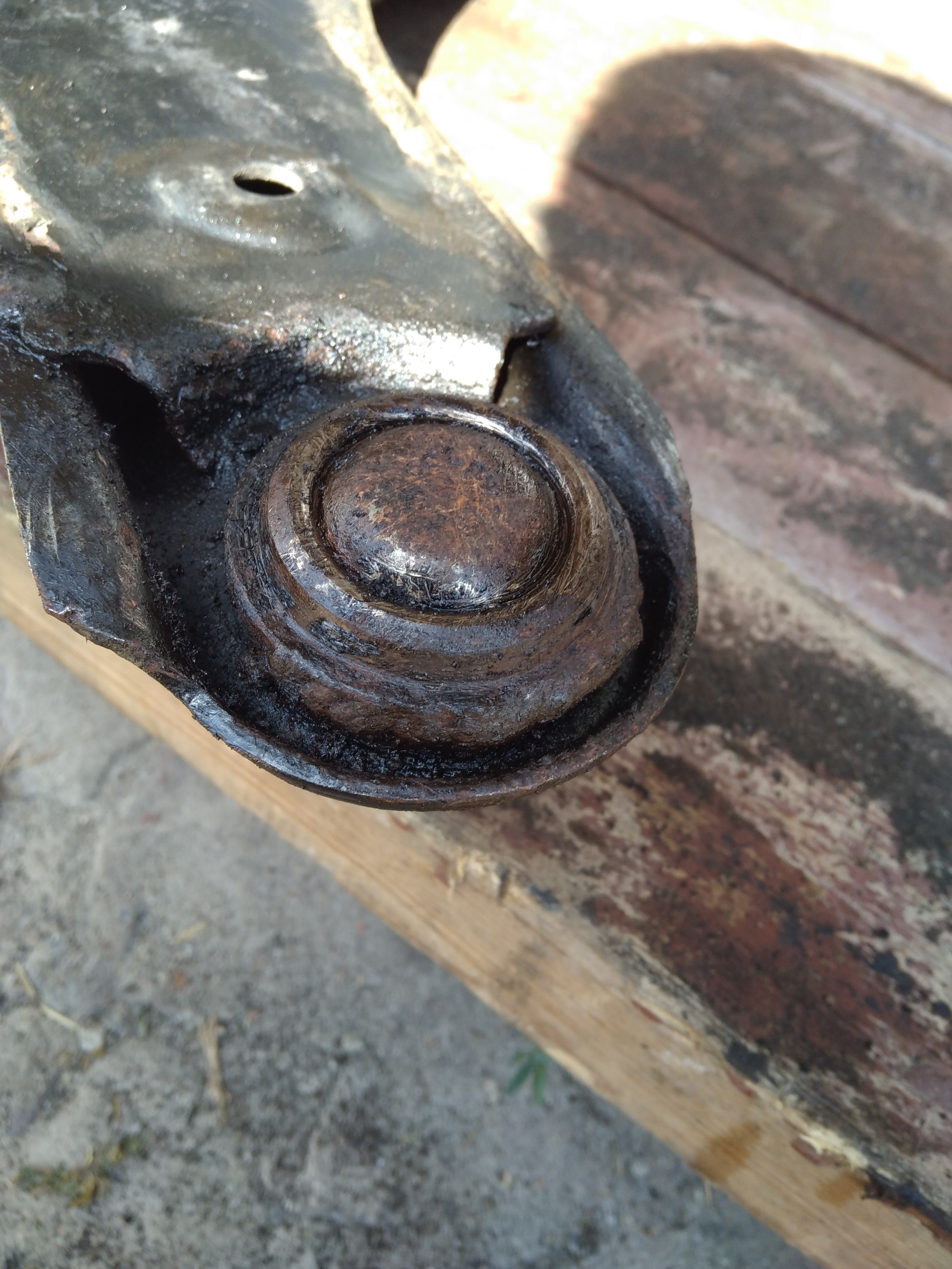 Але є інший "нежданчик". Засвистів підшипник передньої ступиці. Скинув ричаги. Під шумок думав поміняти й шарові. Коли не зміг їх зняти виявилось, що шарова опора підварена до нижнього ричага. Посадочному місцю під шарову опору- гаплик. Цікаво нижні б/у ричаги можна знайти у нормальному стані чи у них у всіх це слабке місце?