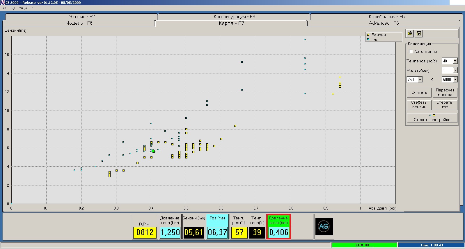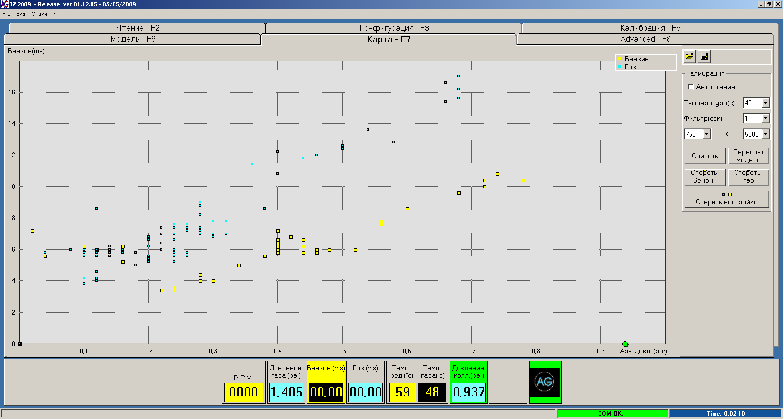 Получается, все это время ездил на ненастроенном ГБО, т.к. график газа всегда был значительно выше графика бензина. Претензий к технике быть не может, она старая. Буду приводить в порядок.