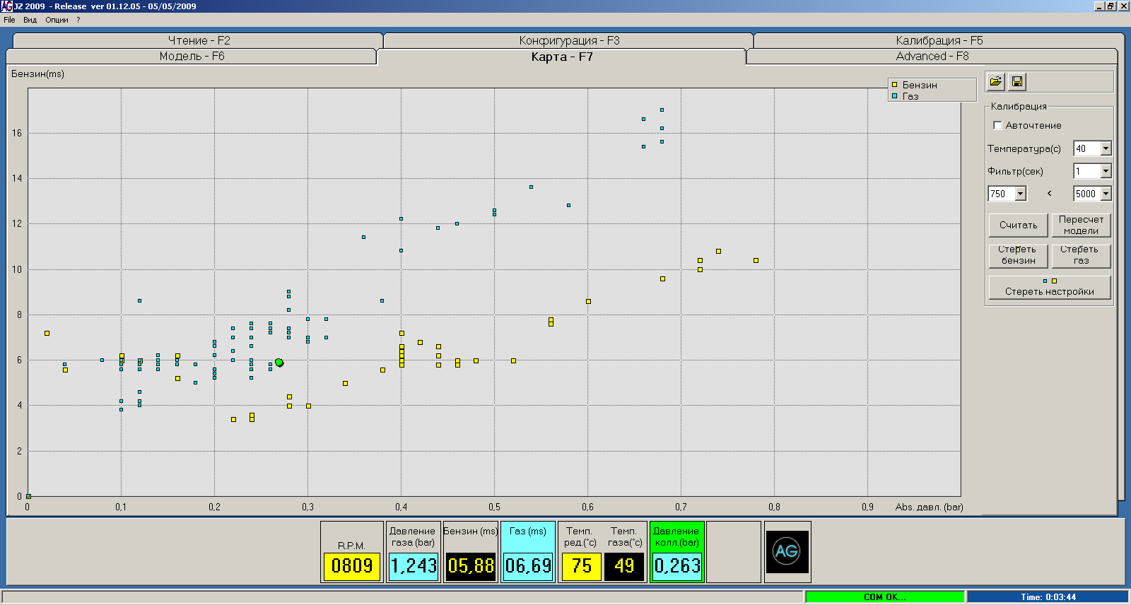 Це картина до заміни. Зверніть увагу на показники тиску газу і розрідження в колекторі. До речі, при заглушеному двигуні датчик розрідження показував 0,5 bar (повинно бути 1,0 bar, тобто 1 атмосфера, це датчик абсолютного тиску).