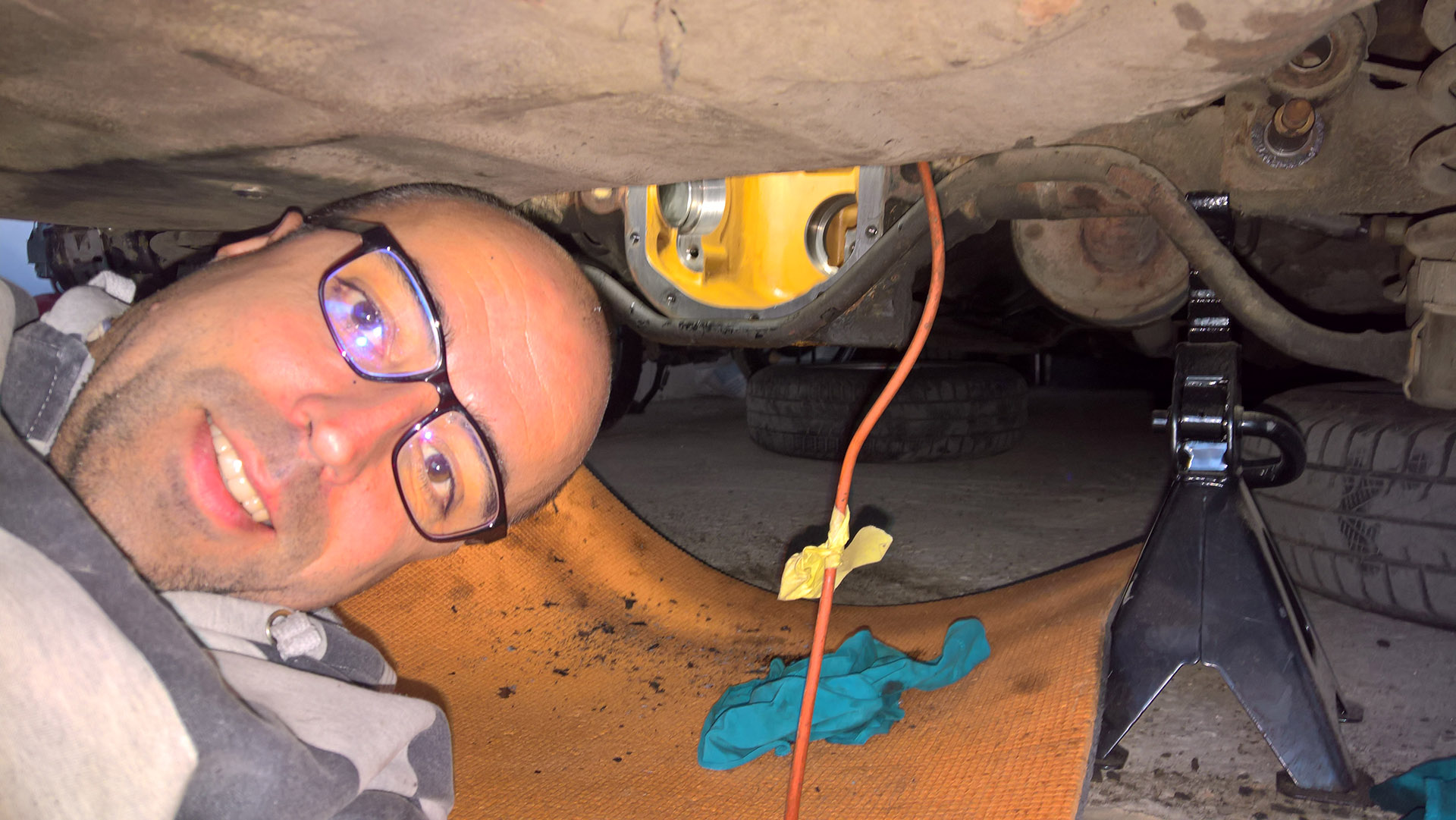 У меня в гараже нет ямы но я все равно решил это сделать сам. Купил "козлы" для вывешивания машины, химию, солярку, притащил в гараж каремат.