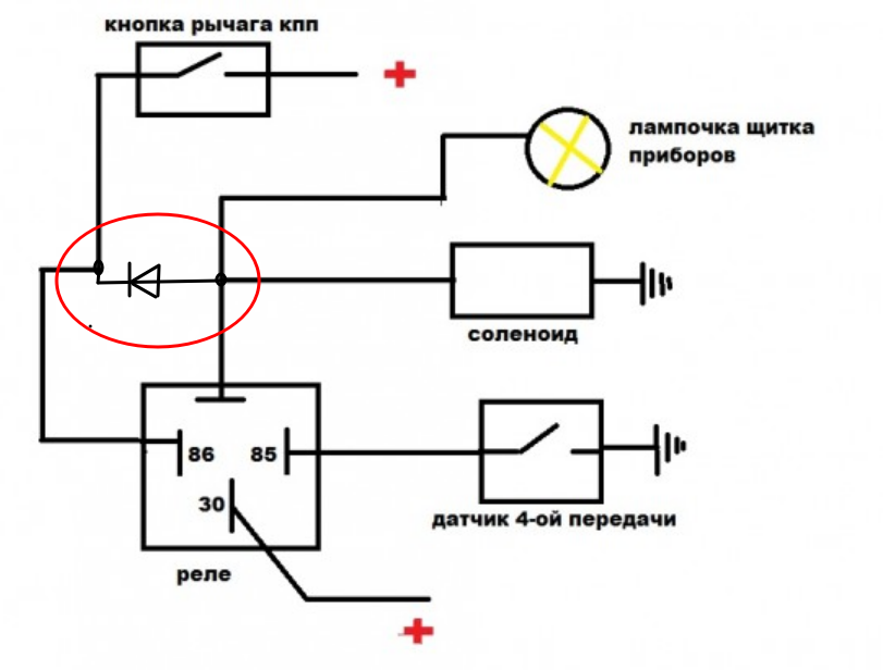На схемі підключення не вистачає елемента, який відповідає за значення швидкості (більше 80 км/год). За такою схемою для спрацьовування соленоїда треба 2 умови (натиснена кнопка на важелі перемикання передач і замкнений кінцевий вимикач 4-ї передачі).