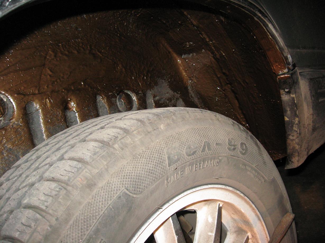 в сявязи с тем что осталось пол банки антикора, решил вычистить и обработать арки, так как местами уже смыло краску с арок, и это мне не очень то нравится! решил мазать только в тех местах где вымыло краску и старый антикор. очень хорошо получается если антикор нагревать! растворитель из него испаряется, и когда его наносишь - он достаточно быстро сохнет и ложится таким... приличным слоем, что для арок как раз самое оно!))