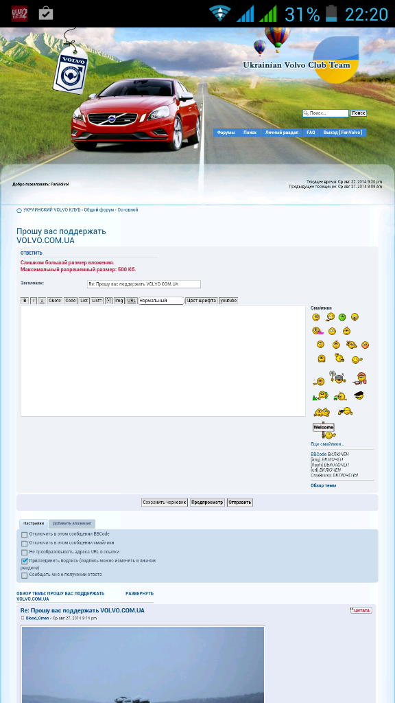 FanVolvo писал(а):Это пиз.ец какойто, может еще раз по 50 грн скинемся чтоб нормальные фотки можно было выкладывать, я час пытаюсь поменять аву, уже сжал до 10*10пикселей а оно мне говорит большой размер, разве ж так можно над людьми издеваться![]()