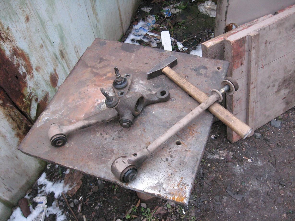 шаг четвертый: мягкой выколоткой выбиваем болты крепления рычагов к кузову и вытаскиваем всю требуху вместе с шаровой( потом ее гораздо проще вытащить, когда рычаг лежит на коленях)
