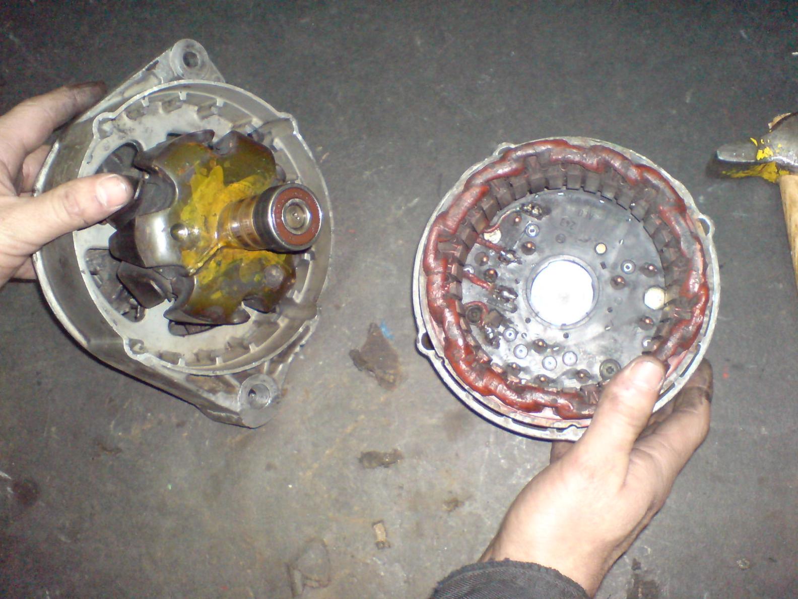 Метим взаимное положение крышек и колем генератор через проставку (деревяшку) ударами молотка попчерёдно по одному и другому уху (крепления гены, конечно). Раскалывать генератор двумя отвёртками как советуют в мурзилке не советую - лёгким движением руки провода обмоток можно превратить во вторсырьё. Стараемся, чтобы статорная обмотка отходила вместе с задней крышкой, иначе оборвём концы.