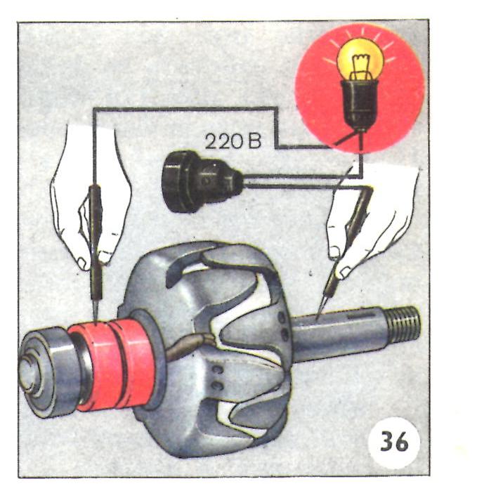 точно так же проверяем якорь - один провод прибора на корпус, второй - наконтактное кольцо.