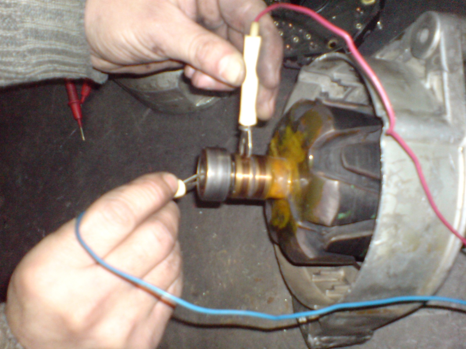 Проверка изоляции статора мегаомметром: один првод (щуп) на корпус, второй поочерёдно на каждый из выводов - результат должен быть не менее 0,8 мегаом (800 килоом), лучше всего - безконечность
