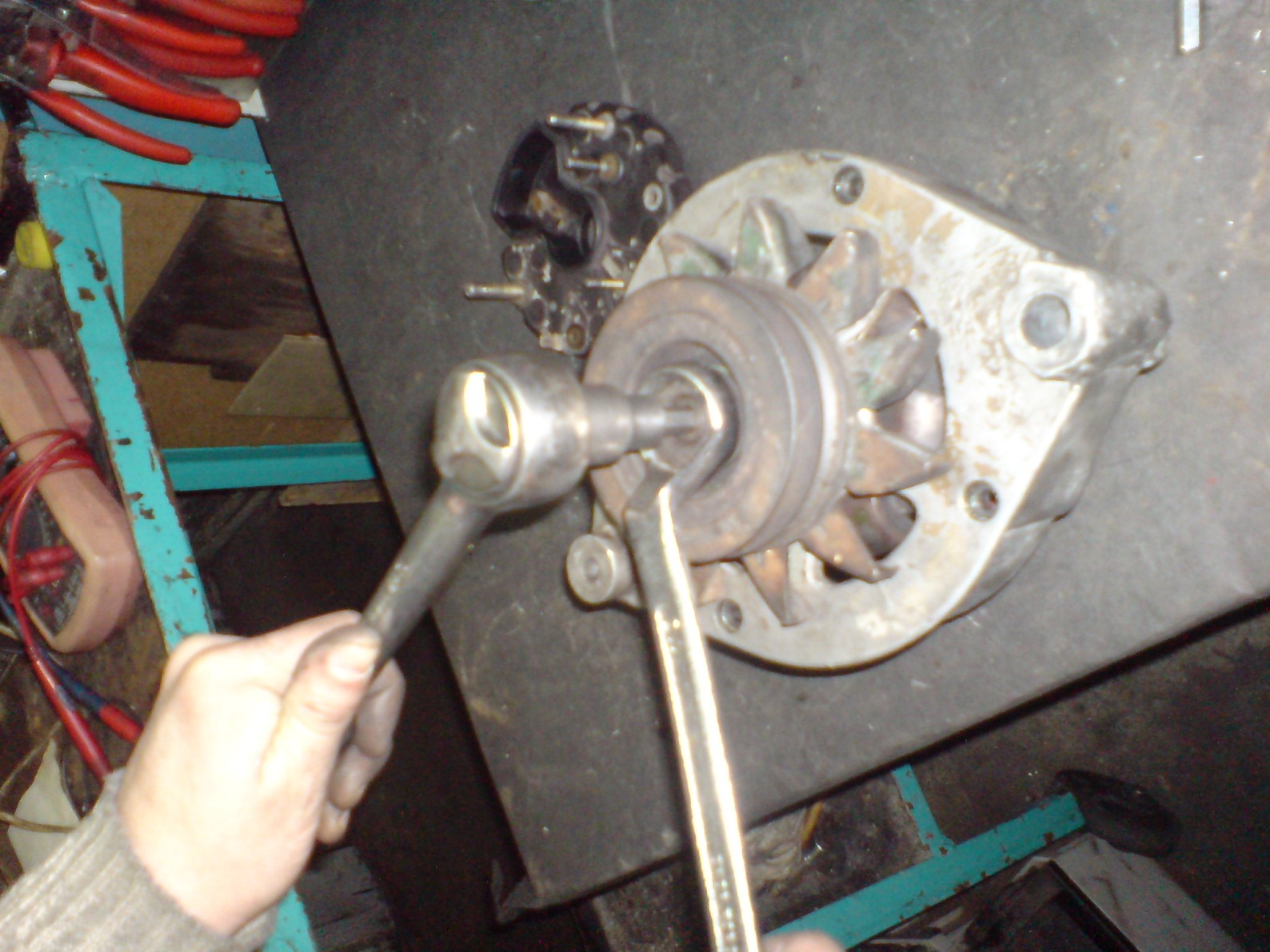 Откручиваем гайку, снимаем шкивок и крыльчатку, обратив внимание на то, какой стороной стоит шайба под крыльчаткой. Если гайка не откручивается, а неоткручивается она почти всегда, зажимаем аккуратно якорь в тиски и всё без проблем откручиваем.