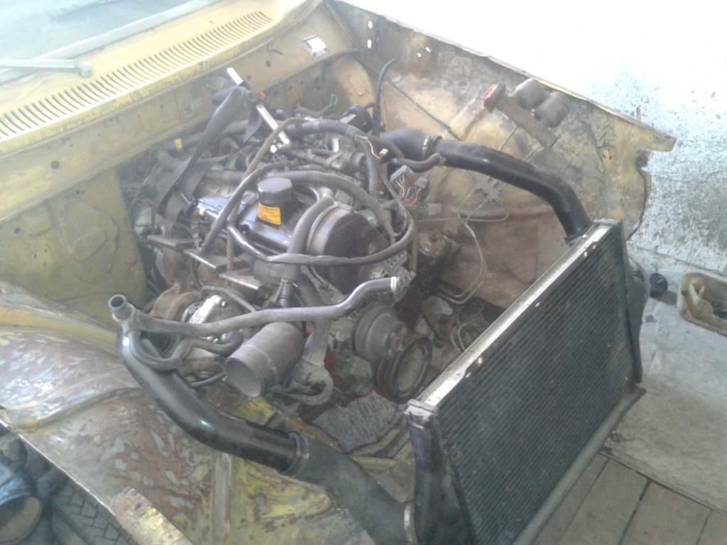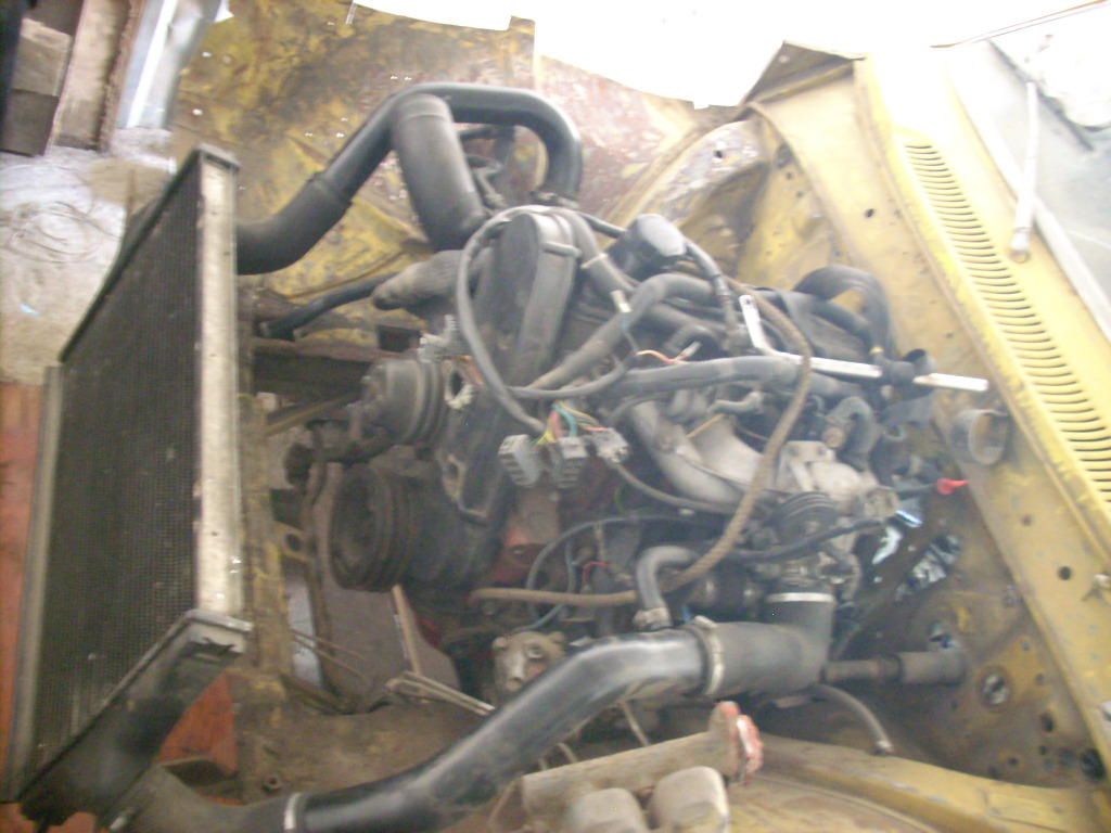 родной радиатор под ел. вентилятор оказался здесь очень большой, поетому было принято решение замены его на Фордовский с сиерры, он не такой высокий и что интересно, по патрубках точно такой же! сделал для него крепления--вроди норм. получилось! 8-)