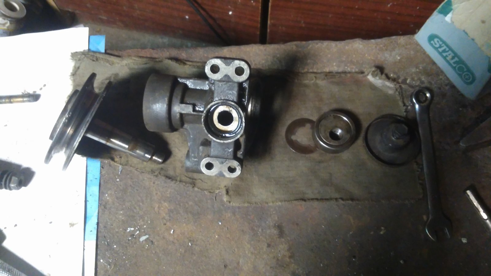 Вибиваємо заглушку. Під нею — підшипник на ексцентрику. Він накручений на вал, різьба права. Стопоримо в корпусі и крутимо за шків. Стопорити треба акуратно — корпус алюмінєвий !