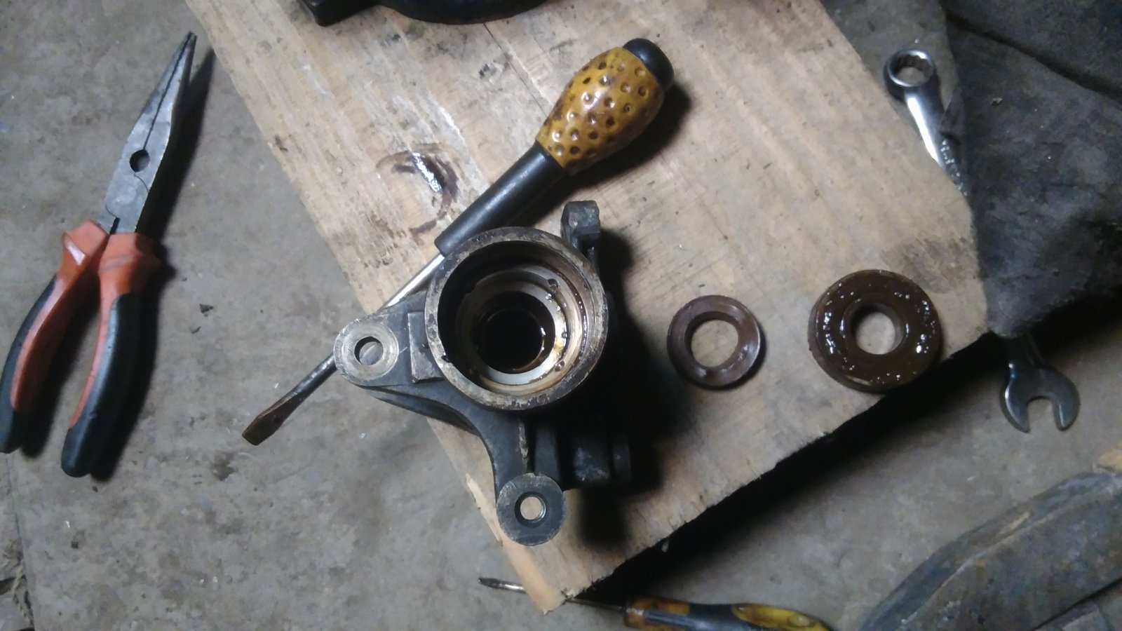 Снимаємо стопорне кільце, витягуєм підшипник. Під ним — сальник.