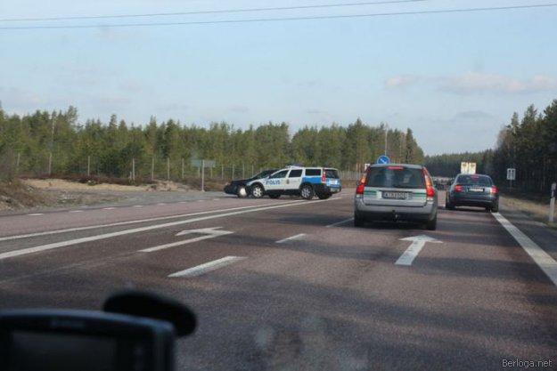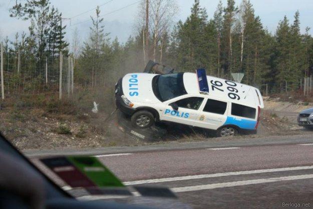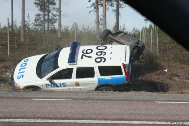 Шведская полиция гналась за двумя пьяными автоугонщиками. В какой-то момент полицейский автомобиль Volvo XC70, который двигался во встречном направлении, резко развернулся и протаранил Audi A6, в котором сидели угонщики. "