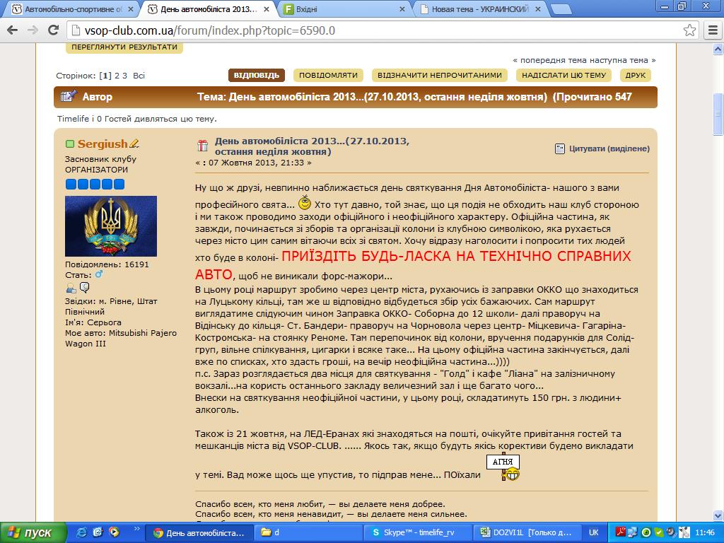 Оскільки 27 жовтня відбудеться наше з вами свято - день автомобіліста, пропоную взяти участь в автопробігу.