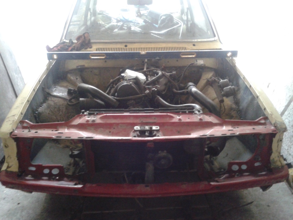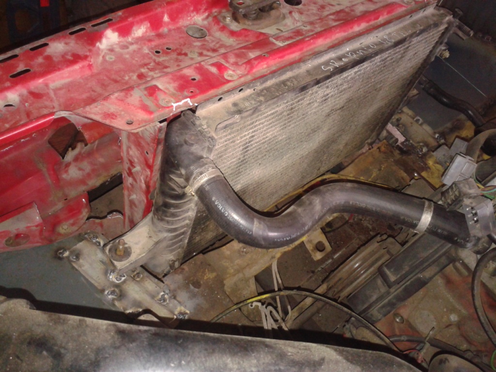 родной радиатор под ел. вентилятор оказался здесь очень большой, поетому было принято решение замены его на Фордовский с сиерры, он не такой высокий и что интересно, по патрубках точно такой же! сделал для него крепления--вроди норм. получилось! 8-)