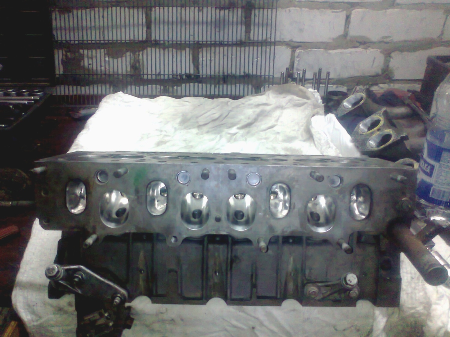 Следующую проблему создал себе сам. Начал пищать ремень, подтянул большой ремень, который крутит помпу, ГУР и кондер - пищать стало меньше. Подтянул еще - пищит. Потом еще - все равно пищит. Подтянул ремень генератора - перестало пищать, а большой ремень не отпустил. Через пару месяцев он не выдержал и от него оторвался один ручеек и попал под ремень ГРМ со всеми вытекающими последствиями (клапана, направляющие,сальники клапанов). Денег на СТО не было и работы было мало потому полез делать сам. Оказалось ничего там страшного нет, если знаком Валерой и Алексеем (Кравец). ОГРОМНОЕ им спасибо - Валере за продолжительные консультации, Лехе за запчасти и поиск шайб. Попутно с ремонтом головы поменял свой рычащий ГУР на ГУР "от Валеры". Мой знакомый, занимающийся в свободное от работы время полировкой и тюнингом мотоциклов должен был мне денег, поэтому я ему предложил отработать долг на голове. За 22 часа он отшлифовал и отполировал каналы, подогнал все стыки на впуске. Что получилось видно на фото. Шарошкой я убрал пузыри сварки в приемной трубе выпуска, заварил пару сверчков и все герметично собрал. Эффект конечно не сногсшибательный, но середина и верх ощутимо подросли. Расход не изменился. И звук выхлопа интересней стал.