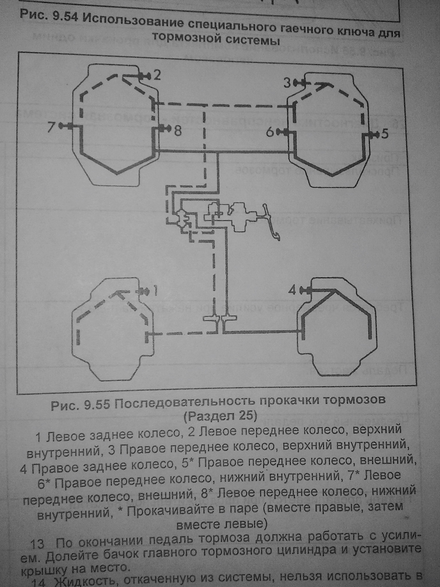 Задний сайлент рычага пришлось приваривать, т.к. чашка уже не алё. Со шлангами тоже мужики натрахались, но заменили. И тут возник такой вопрос: горит сигнальная лампа падения давления в тормозной системе. Ход педали стал чуть мягче, возможно и больше. Это из-за того, что неправильно тормоза прокачали и воздух остался в системе? Или ещё какие варианты срабатывания лампы есть? Мужики все 6 штуцеров прокачали спереди, но вот в какой последовательности не знаю. Прийдя домой нашел в букварике схему правильной прокачки. Что посоветуете делать, перепрокачать систему?