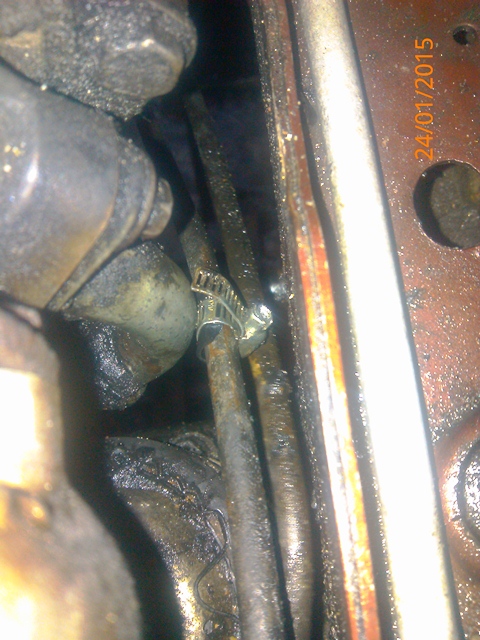 указал стрелкой где оно течет на заведенном двигателе...