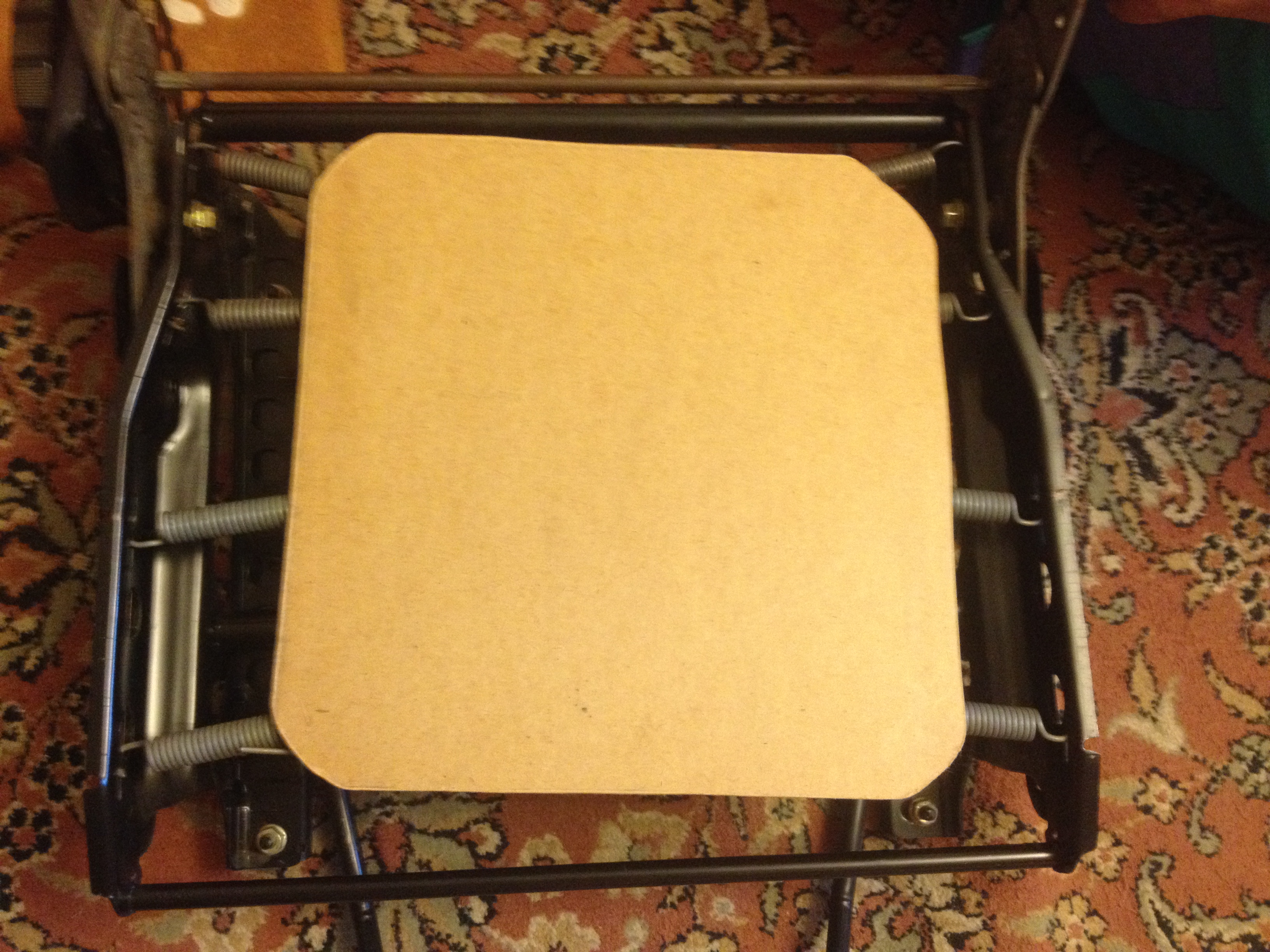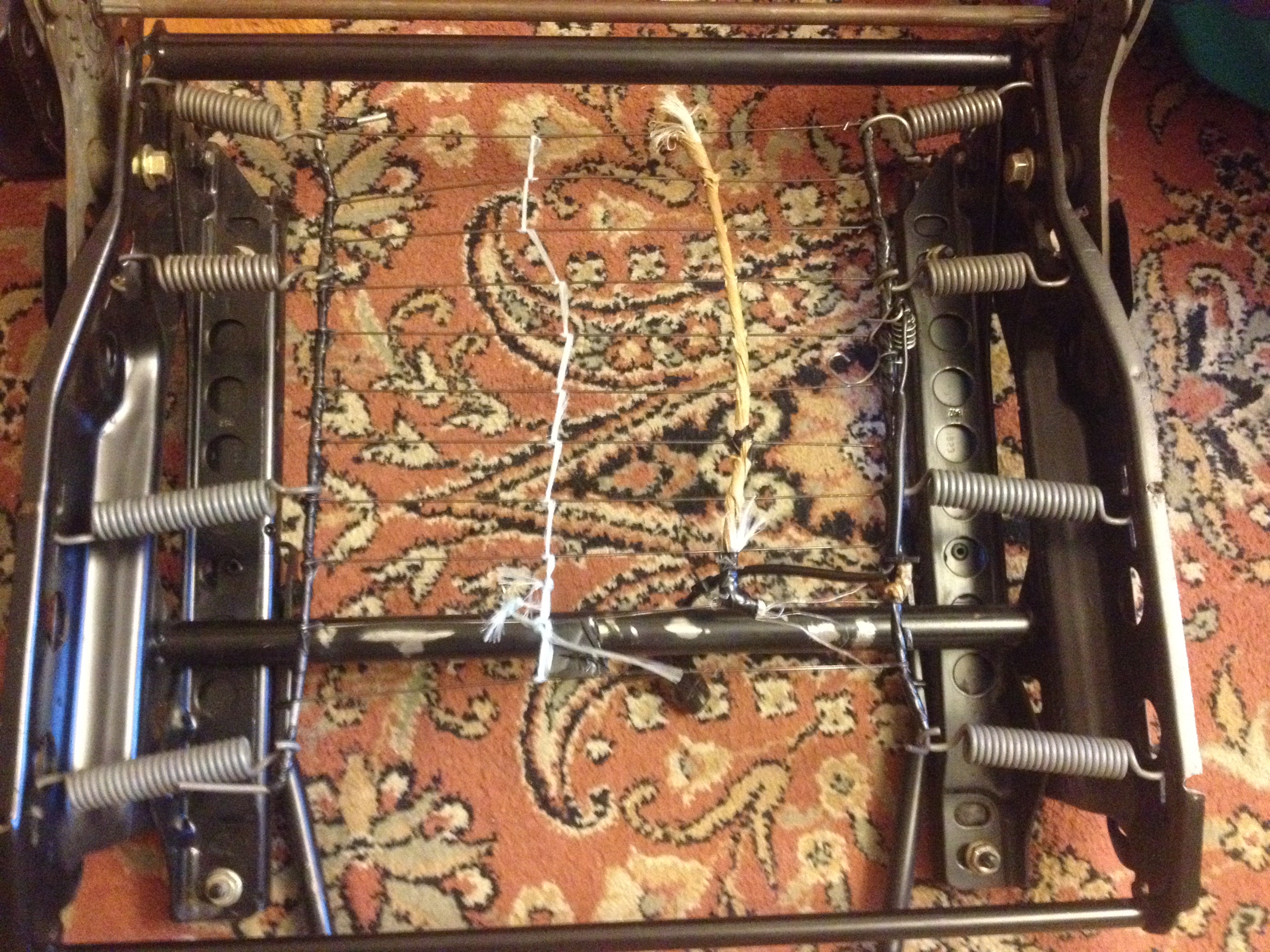 Материалы: лист поролона (это он белый) — 1000х2000х20мм (можно было и 10мм), клей для поролона или 88й — 0,7л, жесткая 3мм стальная проволка — полтора метра, лист оргалита 3мм — 35*70см, моток скотча, сотня хомутов 150*2,5мм, метр верёвки, пара недостающих пружин из тормозного механизма от ВАЗа.