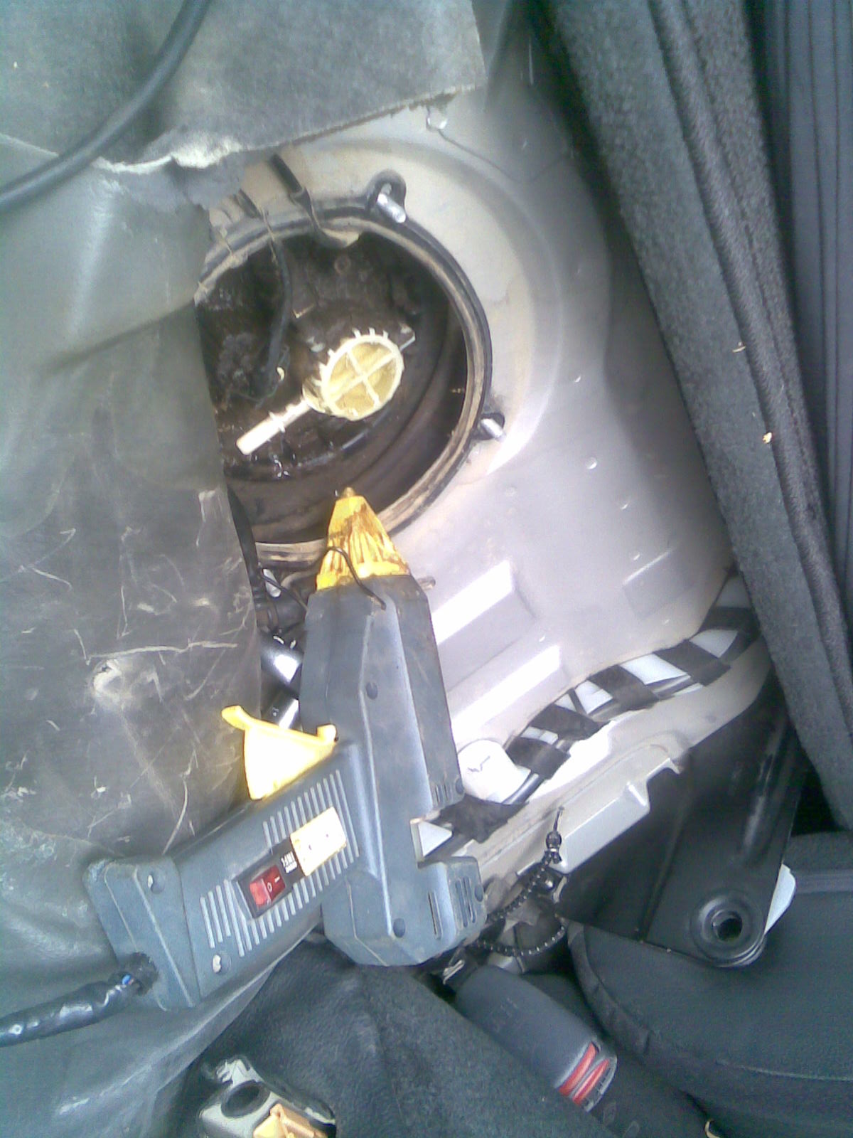 Ну с продолжим, лечение болячки усталости пластикового корпуса редукционного клапана бензонасоса, образовывается микротрещина и бенз потихоньку уходит на улицу. Симптомы: запах бенза у машины, неуверенный запуск после простоя, падает давление в рампе ну и расход выше нормы. Снимаем лючок и видим такую картину.