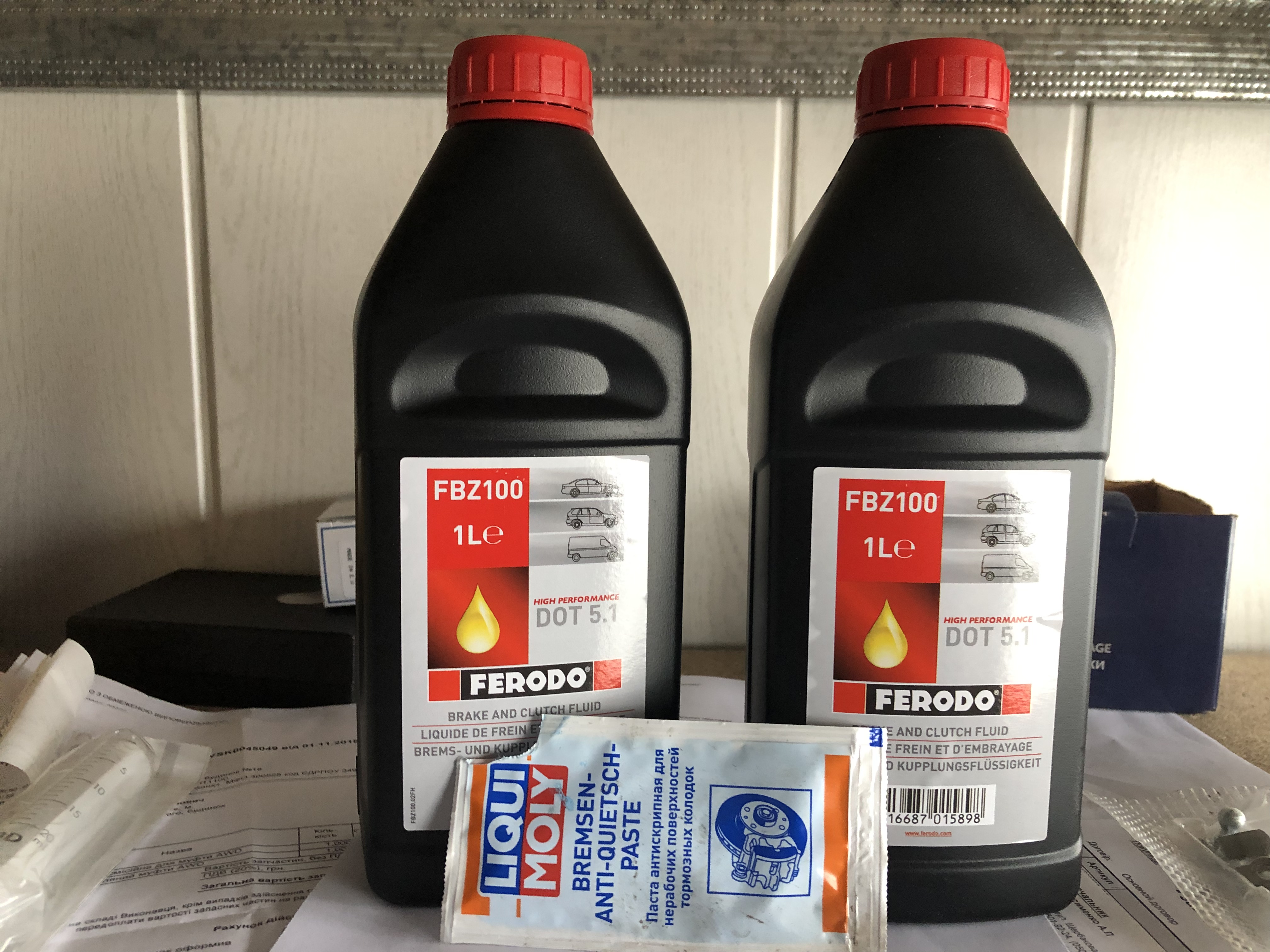 Також, берем пасту для усунення скрипу та купую два літри гальмівної рідини для повної заміни.