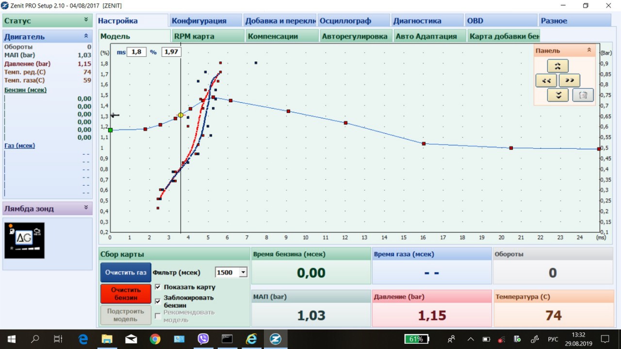 Без ОБД. Вернее обд через елмку, а остальное через программу стага. Ну и сильно помогла авто адаптация стаговская. А зенит и с обд и автоадаптпцией а выдает кривую, как бык поссал.