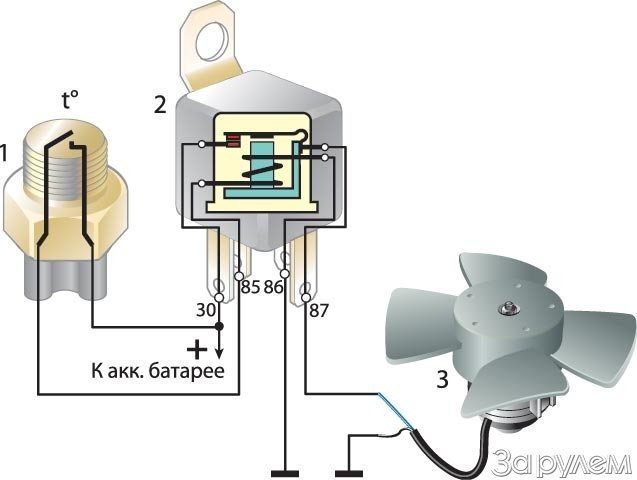 Когда то ставил себе электровентилятор на 40-й москвич, думал, экспериментировал. Получилось, в результате, отлично. Так что знаю, о чем пишу. И сколько работы тоже знаю. Вот, к стати, схема подключения карлсона: