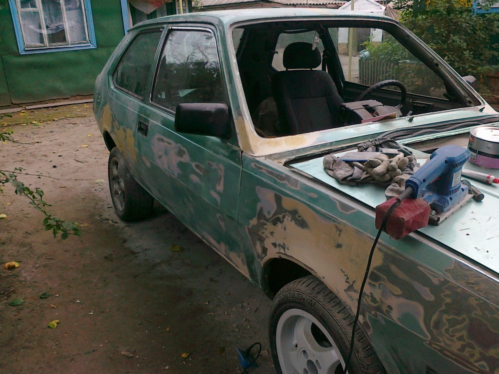 После поварки, авто надо красить. Долго думал, отдать кому-то или самому заняться, время свободное было. Готов был купить себе компрессор и краскопульт. Поспрашивал, кто и за сколько сможет покрасить авто, цены были от 4000 грн до 10 000 тыс грн. Я решил подготовить авто сам, а покрасит знакомый моего папы. Купил материалы: грунт - Novol 131, шпатлевка - Novol универсальная, наждачную бумагу, растворитель, шпателя, Краску - Mobihel Osoka (308), Лак - Duxon. Через дня три приехал поменял краску на Темно зеленую, через неделю, приехал поменял обратно на осоку.Изготавливал автомобиль долго и нудно, много переделывал. Опыта в малярке - ноль, только прочитанные статьи в интернете. Пришло время знакомого папы хотя бы посмотреть на автомобиль, но ему было так влом что-то смотреть, куда-то ехать, а красить и подавно! Я попросил у него компрессор, краскопульт и поехал красить сам. Все было советского производства. Вообщем, качество инструментов меня не порадовало. Но после нескольких дней мучений и тренировок автомобиль покрасил. Получилось неплохо!